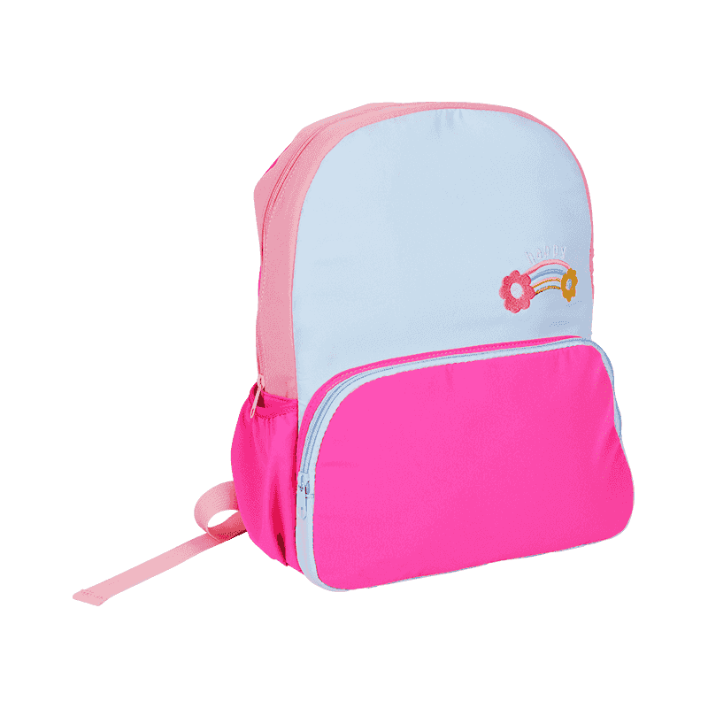 - On the front, there is a zipper pocket adorned in bright pink with a contrasting blue zipper, providing a stylish accent and practical storage for smaller items. This pocket is perfect for storing essentials like pencils, erasers, or a small notebook, ensuring easy access and organization while adding a fun pop of color to the backpack's overall design.
